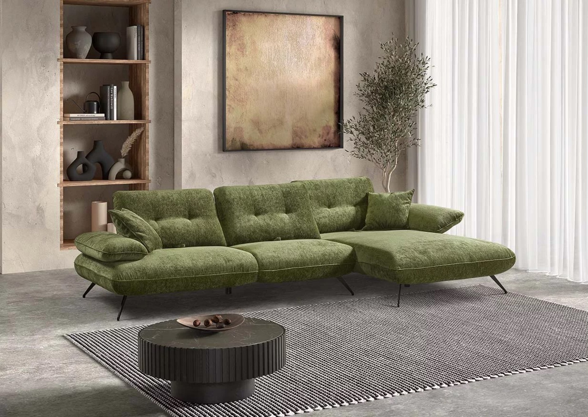 Les pieds fins en métal noir accentuent la légèreté du design, tandis que sa structure généreuse s'intègre parfaitement dans les intérieurs contemporains ou naturels.